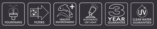 Inpond 5 in 1 pump is a complete âlife support systemâ with decorative fountain features. It includes a pump, filter, 5w UVC and automatic night time LED. Clear water guaranteed