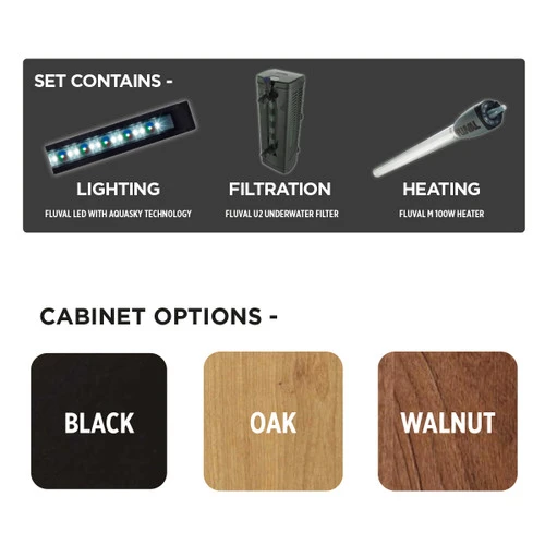 The matching oak cabinet has been thoughtfully designed with features such as an internal storage shelf and soft close hinges, fitted as standard to avoid unnecessary stress to your fish from vibrations.